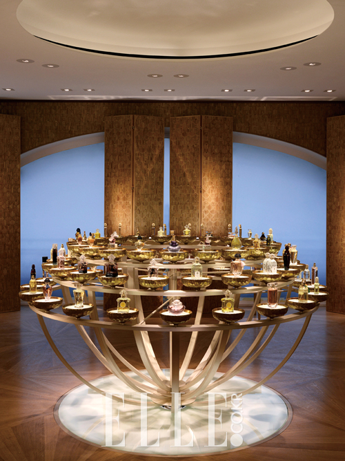 빛의 후광을 받고 서 있는 각종 향수들의 기품 있는 모습에서 시선을 뗄 수 없다. 피터 마리노가 디자인한 유니크한 작품.