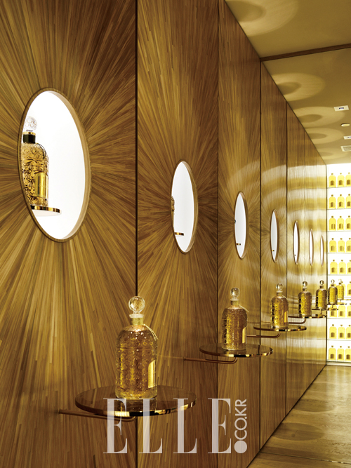 겔랑은 1914년, 샤를르 므웨스(Charles Mewe?s)가 세운 샹젤리제 68번지에 처음 문을 열었다. 1828년 제 1차 세계대전 발발 직전에 ‘미의 전당'이라는 컨셉트로 처음 탄생한 이 공간은 현재 그 규모가 확장되어 무려 212m2에 달한다. 기존에는 전적으로 향수와 관련된 공간이었다면 현재는 코스메틱, 뷰티 그리고 레스토랑과 카페까지 아우르는 복합문화공간으로 다시 태어났다. 아트 컬렉터이기도 한 피터 마리노는 서로 다른 아티스트들에게 각각의 방에 흩어져 있는 작품의 제작을 맡겼다. 마치 오케스트라의 지휘자처럼 한 군단의 아티스트들을 지휘한 셈이다. 그 결과, 17가지의 화려한 대리석으로 장식한 홀에는 미국의 가구 디자이너 하아스 브러더스(Haas Brothers)가 디자인한 거울 천장이 탄생했다. “각 공간의 고유한 부분을 보존하자니 손댈 수 있는 곳이 천장뿐이었어요. 향수만큼 부드러운 물의 질감을 천장에 장식했죠. 그리고 빛과 물의 반사를 생각했어요.” 피터 마리노가 디자인한 금빛 오르간이 마치 한 송이 피어난 꽃처럼 그랜드 살롱 한가운데에 군림하고 있다. 2층의 미장센은 후광이 포인트다. “겔랑을 상징하는 꽃술 모티프는 부티크 곳곳에서 쉽게 찾아볼 수 있어요. 향수병을 장식하고 있는 우아한 곡선은 방돔 광장의 원주 꼭대기 장식에서 따왔죠.” 2층은 스킨케어 존이다. 두 방문 사이를 ‘판테온’으로 변신시킨 크리스티앙 베라르(Christian Be′rard)의 벽화 앞에는 난으로 가득 찬 온실이 있어, 차례를 기다리는 고객들은 이곳을 둘러보느라 지루함을 느낄 틈조차 없다.