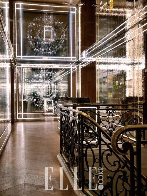화려한 복도에는 작은 살롱들이 줄지어 있고 벽에 걸린 등은 알베르토 자코메티(Alberto Giacometti)의 아플리케다. “이 방의 벽과 바닥은 모두 브라운 오닉스로 장식했고, 오닉스 패널이 액자처럼 가장자리를 둘러싸고 있어요. 오닉스는 향수 바빌론(Babylone)과 오리엔트(Orient)를 상징하죠.” 1층 코스메틱 존은 위 층보다는 한 템포 ‘팝’한 느낌이다. 7m 높이에 달하는 빛의 공간에는 시인이자 디자이너, 건축가인 제라르 숄로(Ge′rard Cholot)의 아름다운 황금 꿀벌들이 날아다닌다. 블랙 컬러로 예술적인 터치를 더한 화이트 대리석 천장, 1200개의 크리스털로 이루어진 샹들리에가 시선을 끈다. 이것은 시작에 불과하다. 이 모던한 궁전이 품고 있는 방에는 오늘날까지 많은 디자이너들에게 영감을 주는 아르데코 디자이너 장-미셸 프랑크(Jean-Michel Frank)를 기리기 위해 실크로 엮은 벽, 상감기법으로 페인팅한 카펫 등 상상을 뛰어넘는 아름다운 오브제들이 곳곳에 퍼져 있다.