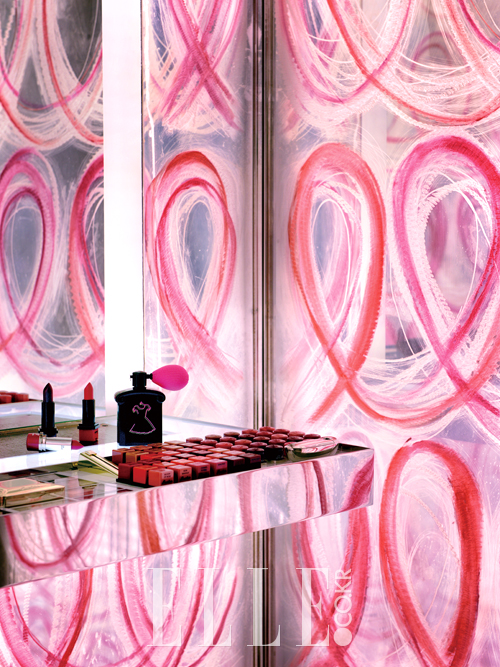 모든 코스메틱 공간은 메이크업 스튜디오처럼 단장했다. 과장된 패턴과 팝 컬러, 역동적인 분위기, 예술 작품으로 탈바꿈한 립스틱 자국 등이 유리 벽을 장식하고 있다.
