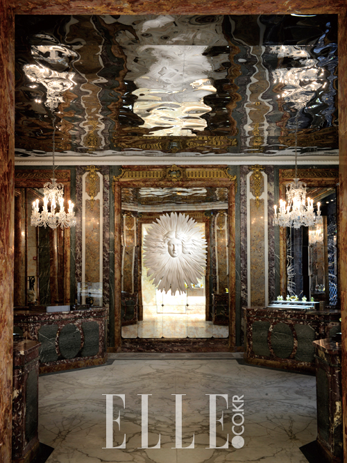 17가지 카라레(Carrare) 대리석으로 타일과 벽을 꾸민 역사적인 공간 ‘미의 전당(Temple of Beauty)’. 메탈 장식 천장은 향수가 가진 후각적 유동성을 극대화한다. 하아스 브러더스의 작품.