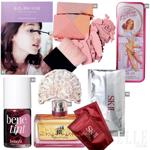 1 유진의 모든 뷰티 노하우를 담은 <유진’s 뷰티 시크릿>. 2 사랑스러운 볼을 위한 시머 블러셔. 베네피트 슈가밤, 단델리온. 각 4만2천원. 3 칵테일 드레스를 입었다면 꼭 챙길 것. 다리와 쇄골 등에 발라 윤기를 주는 베네피트 배씨나 바디 소 파인. 4만6천원. 4 입술에 홍조를 주는 베네피트 베네틴트. 4만5천원. 5 안나 수이 플라이트 오브 팬시 향수. 50ml, 11만원. 6 SK-Ⅱ 화이트닝 소스 덤 리바이벌 프로그램, 11만원.