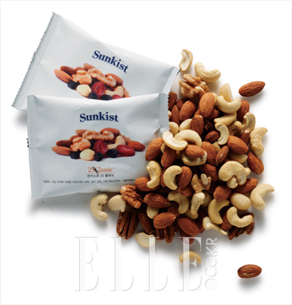 단백질이 풍부한 아몬드, 오메가 3가 가득한 호두, 비타민 K가 충만한 캐슈너트, 콜레스테롤 수치를 낮춰주는 피스타치오 같은 견과류 등은 일명 두뇌 간식으로 불린다. 하루 섭취량인 25g들이 썬키스트 ‘25클래식 하루견과, 그린너트의 ‘매일 매일 건강 채움’ 같은 제품들은 건과일까지 더해 아침 식사, 간식 대용으로 인기다.