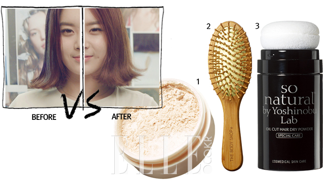 만지면 기름기가 묻어날 만큼 떡진 머리에는 드라이 샴푸가 필수품. 여기에 피니시 파우더를 섞어 사용하면 효과가 배가된다. 드라이 샴푸가 두피를 청결하게 해준다면 피니시 파우더는 모발을 즉각적으로 보송보송하게 만들어주기 때문. 방법도 간단하다. 먼저 모발의 섹션을 나눈 다음 드라이 샴푸를 골고루 뿌린다. 그런 후 피니시 파우더를 뿌려 쿠션 브러시로 가볍게 빗으면 되는데 중요한 건 두 제품이 잘 뭉쳐지도록 드라이 샴푸는 반드시 파우더 타입으로 선택할 것.