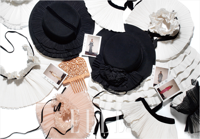 크고 작은 움직임에 일렁이는 빳빳한 플리츠의 향연은 마치 60년대 플라멩코 댄서들의 정열적인 춤사위를 떠올리게 한다. 작은 빗에 정교하게 조각된 작은 새와 페이즐리 문양들은 컬렉션 전반에 걸쳐 매혹적인 이어링으로 재탄생! 지춘희