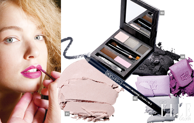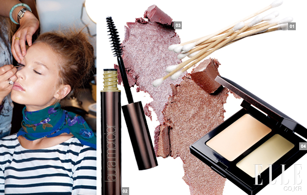 1 피부부터 아이 메이크업까지. 수정 화장 시 꼭 필요한 면봉. 눈썹 컬링으로도 활용하려면 우드 스틱을 고를 것. 2 투명 마스카라로 활용 가능한 로라 메르시에 아이브로우 젤, 3만2천원. 3 에스티 로더 더블 웨어 스테이-인-플레이스 섀도우 스틱, 04 핑크 쉘, 각 2만8천원. 4 로라 메르시에 시크릿 카뮤 플라지, 4만2천원.