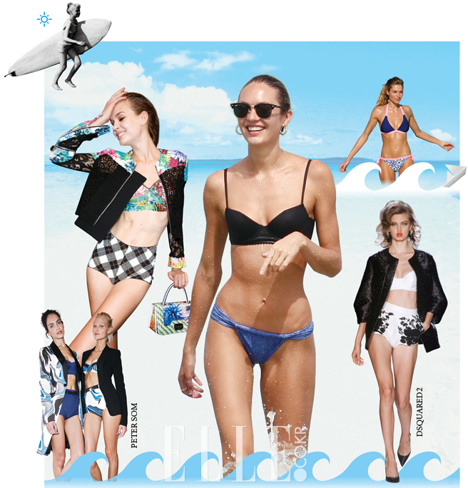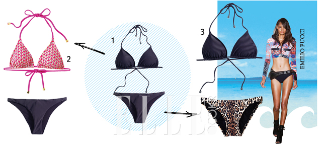 분명 다른 스타일의 비키니 톱과 보텀을 입었지만 전혀 어색하지 않은 빅토리아 시크릿의 애인절 캔디스 스와네포엘. 그녀의 치명적인 보디라인을 따라잡을 순 없다 해도 비키니를 믹스매치해 입는 신선한 비치 스타일링은 한 번쯤 도전해 볼 만하다. ‘Asos.com’과 같은 온라인 패션 스토어의 수영복 섹션에서도 톱과 보텀의 개별 구매를 권하는 ‘Mix & Match’ 버튼이 있을 정도이니, 여름휴가를 앞두고 있다면 비키니 믹스매치 실전에 돌입해야 할 때. 도전에 필요한 첫 번째 준비물은 심플하고 베이식한 단색 비키니 아이템이다. 그에 맞는 화려한 프린트나 컬러가 가미된 비키니를 매치하는 것이 다음 단계. 같은 컬러가 베이스로 깔린 것이나 프린트 중간중간에 비슷한 계열의 컬러 포인트가 들어간 비키니를 서로 짝지어 주는 것이 가장 쉬운 방법이다.
