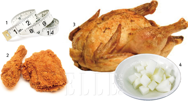 치킨은 당연히 고 칼로리 식품이다. 치킨 프랜차이즈 업체들이 밝힌 정보에 따르면 치킨 한 조각의 열량은 220~300Kcal 수준. 한 마리로 환산하면 프라이드 치킨은 1700~2000Kcal 정도 된다. 한 마리의 치킨이 삼시세끼 섭취한 열량보다 많을 수도 있다! 치킨의 이런 칼로리는 닭보다 튀김옷에서 나온다. 사람들이 고기는 살이 찐다며 무작정 터부시하지만 닭과 같은 가금류의 고기는 단백질이 풍부해 다이어트 식품으로 각광받고 있지 않은가. 식용유를 머금고 있는 튀김옷이 진짜 문제다. 더불어 의외의 복병은 '양념 치킨'이다. 업체마다 양념 치킨의 칼로리는 2000~2700Kcal로 밝히고 있어 프라이드 치킨보다 훨씬 높다. 사실 프라이드 치킨에 추가된 양념만큼 칼로리가 올라가는 것은 당연한데 이 정도로 차이가 크게 나는 것을 모르는 경우가 많다. 이것은 치킨 양념의 제조 과정과 원료를 떠올려보면 쉽게 이해된다. 한국식 치킨 양념은 달달한 맛과 점성을 내기 위해 물엿과 설탕이 상당한 양을 차지한다. 결국 다이어트를 생각한다면 기름기를 쪽 뺐다는 오븐구이 치킨이 정답이다. 튀김옷과 양념이 없기 때문에 한 마리에 1000Kcal까지 열량 차이가 난다. 물론 바삭바삭한 맛을 느낄 수 없다며 거부감을 느끼는 이들을 위한 대안이 있다. 똑같이 오븐을 이용하지만 ‘베이크 치킨’을 만드는 업소들을 찾아보자. 스프레이를 이용해 재료 위에 최소한의 기름을 뿌리고 컨벡션 오븐을 이용해 치킨을 만들면 칼로리 증가는 최소화하면서 바삭바삭한 치킨을 즐길 수 있다. 사실 요즘 유행하는 ‘에어 프라이’ 튀김기가 이와 유사한 원리를 차용하고 있다.