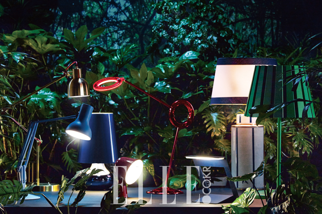 (왼쪽부터 오른쪽으로) 원하는 높이와 각도를 조절할 수 있는 하늘색 스탠드 ‘타입 75 미니 파우더 블루’는 23만6천원, Anglepoise by Rooming. 빨간 선이 눈에 띄는 브라스 소재의 관절 테이블 램프는 가격 미정, 이상민 작가의 작품. 반짝이는 철제 소재의 네이비 컬러 ‘램프 신디(Lamp Cindy)’는 32만4천원, Kartell.  강렬한 레드 컬러의 아물레또(Amuleto) 스탠드는 가격 미정, Ramun. 이오나 보트랭(Ionna Vautrin)이 디자인한 버섯을 닮은 모양의 레드 컬러 미니 램프 ‘비닉(Binic)’은 36만원, Foscarini by A-hus. 진한 노란색 선이 포인트인 철제 테이블 램프 ‘마가렛’은 가격 미정, THEedit. 도자기 소재의 베이스에 블루 스트라이프 패턴의 갓이 있는 스탠드는 80만5천원, Teohome. 선명한 그린 컬러 테이블 램프 ‘탱크_T2’는 90만원, Established & Sons by hL1991.