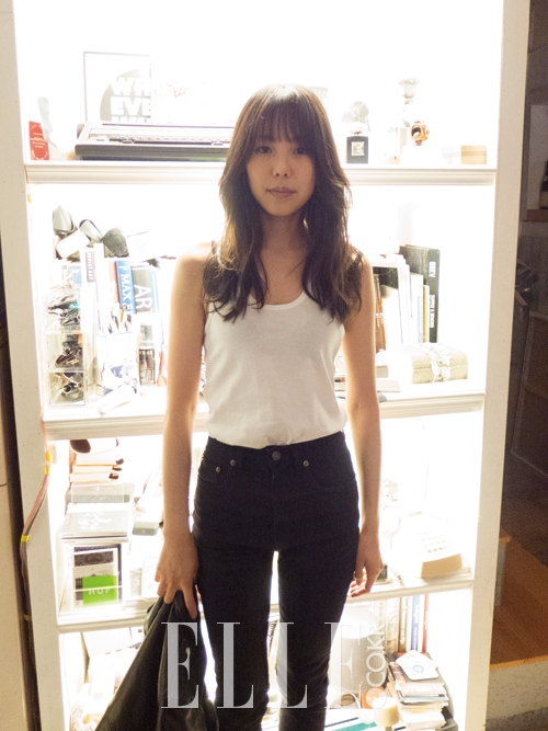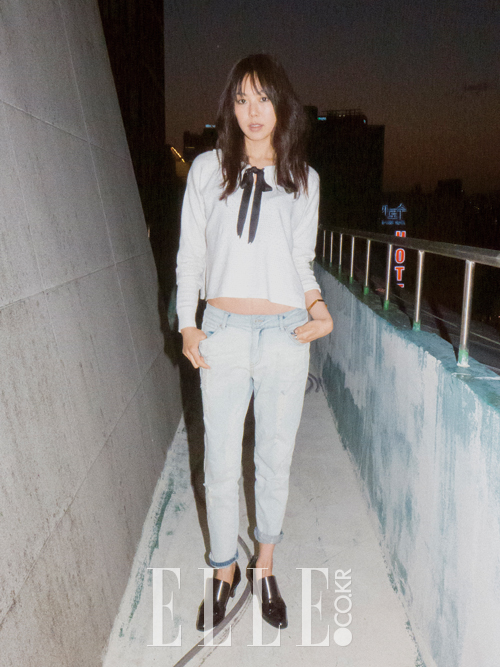 리본 디테일의 니트 톱은 Claudie Pierlot. 빈티지한 데님 팬츠는 Tankus. 블랙 컬러의 페이턴트 슈즈는 Suecomma Bonnie. 골드 뱅글은 Saint Laurent by Hedi Slimane.