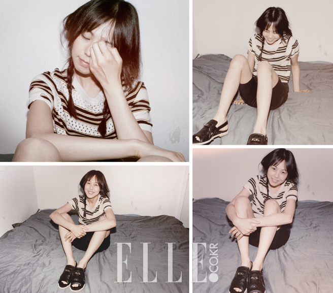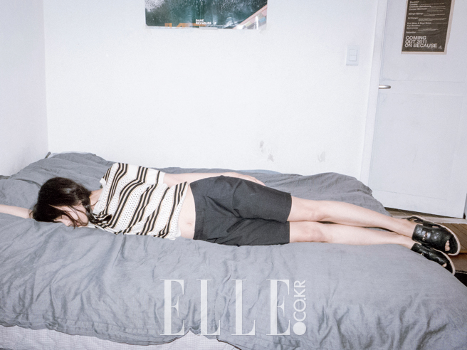 스트라이프 패턴의 니트 톱은 See by Chloe. 매니시한 하프 팬츠는 Jain Song. 블랙 컬러의 퀼팅 샌들은 Chanel.