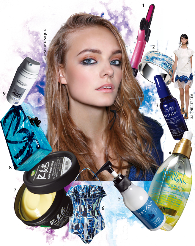 이번 시즌 헤어 스타일에 있어 트렌디해 보이는 한 끗 차이는 ‘글로시 터치’에 있다. 해변에서 한바탕 뛰어논 듯, 비에 젖은 듯 모발에 촉촉함을 부여해야 한다는 뜻. 헝클어진 웨이브를 흠뻑 적셔 섹시한 아마존 여전사를 표현한 톱숍 유니크, 모발을 두상에 납작하게 붙여 시크한 웨트 룩을 선보인 데스켄스 티어리의 런웨이를 참고할 것. 샤워를 막 마친 듯 머리를 적신 멀버리와 타쿤도 마찬가지. 뜨거운 햇볕 아래에서도 마르지 않는 진득함을 유지하려면? “고데기로 웨이브를 만들고 컬 크림이나 젤리 왁스를 손바닥에 덜어 모발을 비벼주세요. 볼륨이 있으면 어색하니 모근부터 바르는 것을 잊지 말고요. 여기에 오일 미스트를 덧뿌리면 고정력이 배가됩니다.” 헤어 아티스트 조영재의 조언.