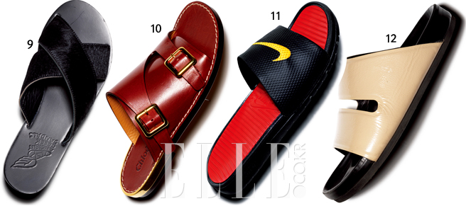 10 정교한 가죽 커팅과 스트랩 디테일 그리고 사이드 메탈 라인으로 슬리퍼의 위상을 드높였다. 1백40만원, 끌로에.