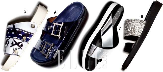 7 투박한 벨티드 슬라이드를 페미닌한 룩과 믹스매치해 상반된 매력을 즐겨볼 것. 46만5천원, 랑방 컬렉션.