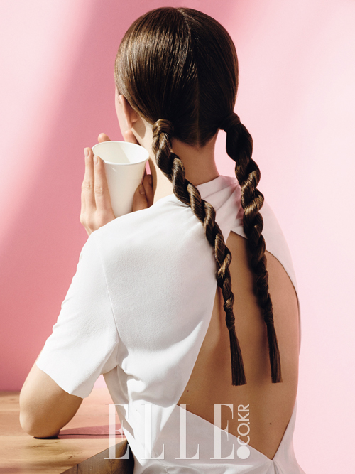 나선형으로 땋아 발랄하고 사랑스럽게 연출한 ‘소녀풍’ 트위스트 헤어. 5:5 가르마를 탄 모발을 양 갈래로 묶고, 각각 모발의 일부로 고무줄을 감췄다. 깔끔한 스타일링을 위해 L’ore′al Professionnel Paris 에르네뜨 스프레이를 뿌린 후, 묶은 모발을 다시 두 갈래로 나눠 촘촘하게 땋았다. 푸석푸석한 모발 끝은 Ayunche 컴플리트 리페어 에센스 오일을 발라 윤기를 부여한 것. 헤어 아티스트 조영재는 두 갈래를 서로 반대 방향으로 꼰 다음 땋아야 ‘꽈배기’ 형태가 풀리지 않는다고 귀띔한다.