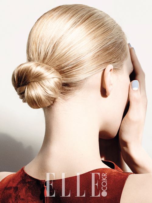 목덜미를 드러내 섹시함을 더한 마이크로 시뇽. 매끈한 텍스처를 만들기 위해 빗으로 모발을 단정하게 빗어 넘긴 후 Aveda 드라이 레미디 데일리 모이스처라이징 오일을 발랐다. 목덜미 부근에서 고무줄로 머리를 묶고, 모발을 둥글게 말아 고무줄 주위를 감았다. 완성된 번은 핀으로 모발 끝부분이 보이지 않게 숨기고 Rene Furterer 피니싱 스프레이로 고정한 것. 헤어 아티스트 김승원은 번 중간 중간에 U핀을 두세 개 꽂으면 온종일 흐트러짐 없이 유지된다고 조언한다.