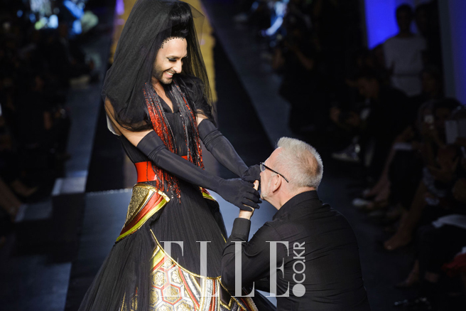 판타지 가득한 쿠튀르 드레스의 행렬 끝에 등장한 고티에 아저씨. 장난꾸러기처럼 무대 위를 정신없이 뛰어다니십니다.