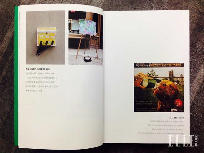 개들을 위한 도시의 배려. 왼쪽 페이지는 배변용 비닐 봉지 박스와 매장 앞의 물 그릇. 오른쪽 페이지는 지하철 광고. ‘당신의 강아지를 도시 안에 있는 모든 공원에서 뛰어놀게 하고 싶다면 라이선스를 얻어라’.