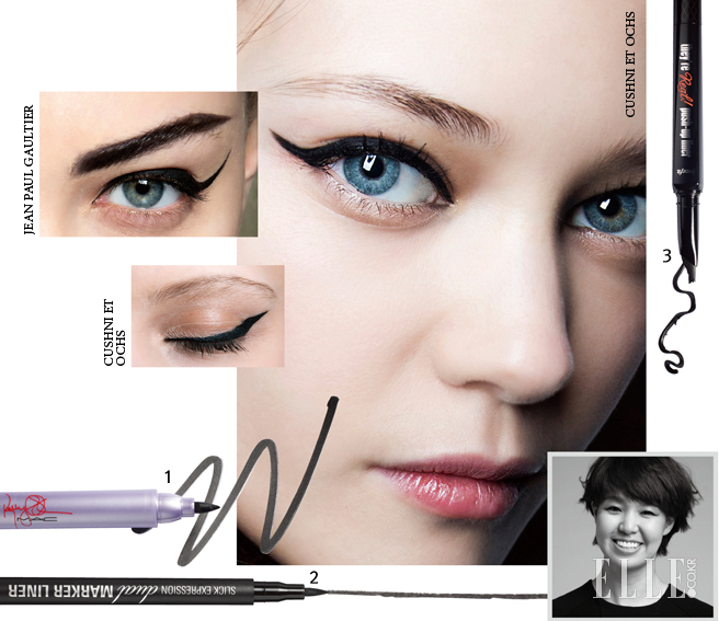 삼손의 힘의 원천이 머리카락에 있다면 뷰티 디렉터 강옥진의 프로페셔널한 인상은 아이라인의 눈꼬리에서 솟아난다! 그녀의 아이라인은 흡사 알렉사 청, 브리짓 바르도, 아델을 연상시키는 눈꼬리를 길고 높게 뺀 볼드한 윙 스타일. 눈에 띄고 선명한 모양이다 보니 제품 선택에 있어서 무엇보다 중요한 건 얼마나 깊고 진하게 발색되느냐, 그리고 번짐 없이 오래 지속되느냐 하는 것이다. 또 눈가에 자극 없이 부드럽게 발리는 사용감까지! 과거엔 이런 조건들이 결코 공존할 수 없었지만 최근 이를 충족시켜 주는 스마트한 라이너들이 속속 출시되고 있다. ‘젤 라이너 펜’ ‘펜슬 타입 젤 라이너’ ‘마커 라이너’ 같은 첨단 네이밍을 한 하이브리드 라이너들을 적극 활용하는 게 뷰티 디렉터다운 그녀의 노하우.
