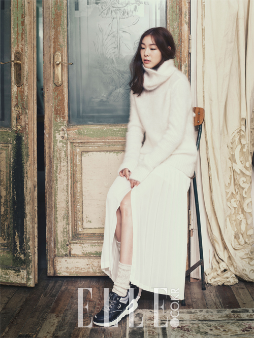 앙고라 화이트 터틀넥 니트는 Wardrobe, 플리츠 롱 스커트는 Paul & Alice, 레더소재의 워킹화는 퀸즈컬렉션 코리아 블랙으로 Prospecs 제품. 니트 삭스는 스타일리스트 소장품.