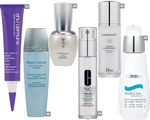 1 Shu Uemura 화이트 리커버리 EX+ 가격 미정 티로시나아제 효소를 억제하고 멜라닌 색소의 구조를 축소시켜 근본적인 피부톤 개선. 30ml. A ★★★★ 피부에 스무스 하게 발리는 부드러운 질감의 텍스처. 이 제품을 바르고 화이트닝 시트 마스크를 사용했더니 유효 성분이 피부 깊숙한 곳까지 전해져 효과가 급상승! B ★★★★ 찐득한 유백색 텍스처로 조금 두껍다 싶을 정도로 바르면 밀리는 감이 있어 오전보다는 취침 전에 사용하기 좋다. 튜브형 용기에 담겨 국소적으로 사용하기 편리한 디자인. C ★★★★ 연고처럼 생긴 패키지. 넓은 부위보다는 트러블 부위나 다크 서클 등 국소 부위에 사용하기 좋다. 눈에 띄는 화이트닝 효과는 없었지만 피부결이 매끄러워지고 보습 효과도 뛰어났다.