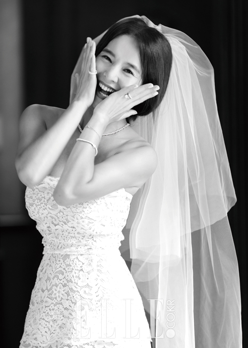 정혜영이 입은 레이스 드레스는 Reehue. 쇼트 베일은 Carrie bridal. 오른손 새끼손가락의 꽃잎 모티프를 다이아몬드 파베 세팅한 링, 왼손 네 번째 손가락의 볼드한 다이아몬드 링, 함께 레이어드한 세컨드 링, 다이아몬드 네크리스, 브레이슬렛은 모두 Tiffany & Co.