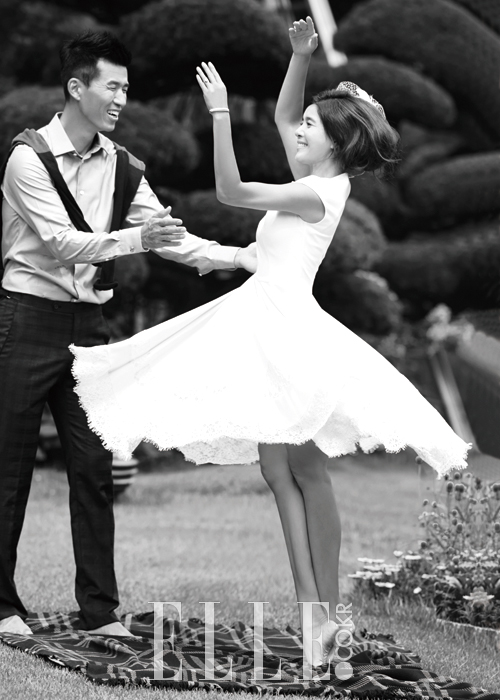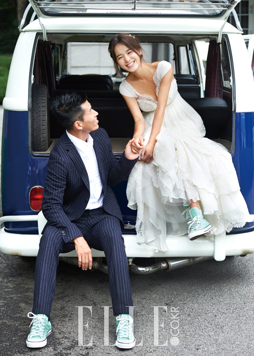 정혜영이 입은 캡 소매 드레스는 Souhait de Blanc by Atelier Aimee. 션이 입은 핀 스트라이프 수트는 Gucci. 슈즈는 모두 Converse.