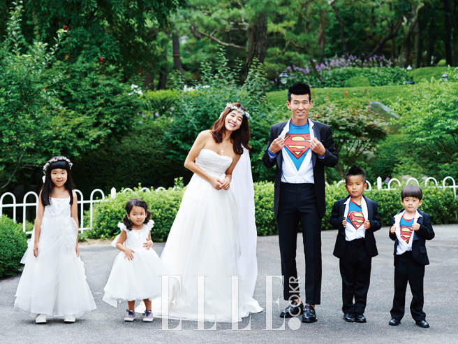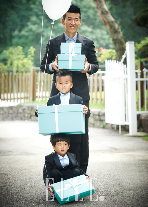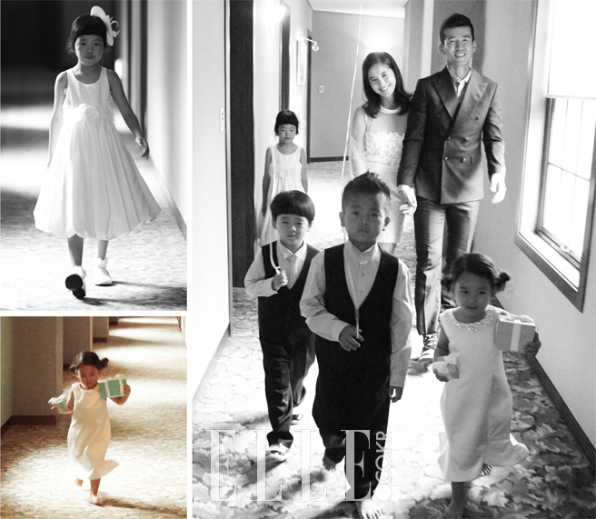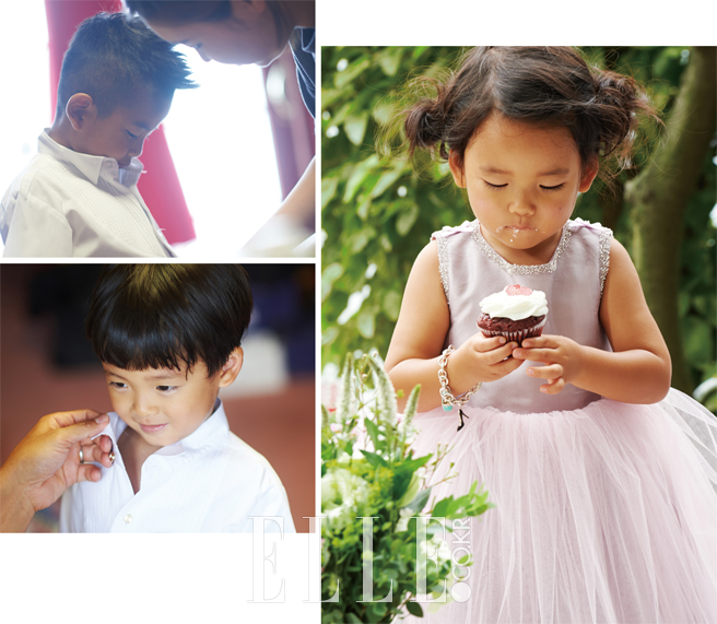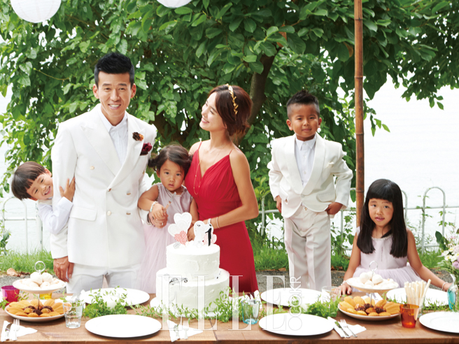 정혜영이 입은 레드 드레스는 Leeseungjin. 션의 화이트 수트는 Cymbidium. 하음과 하엘의 라벤더 드레스는 Dearb. 하랑과 하율의 화이트 수트는 Bebestar. 정혜영이 착용한 네크리스와 브레이슬렛, 하엘의 참 브레이슬렛은 모두 Tiffany & Co.