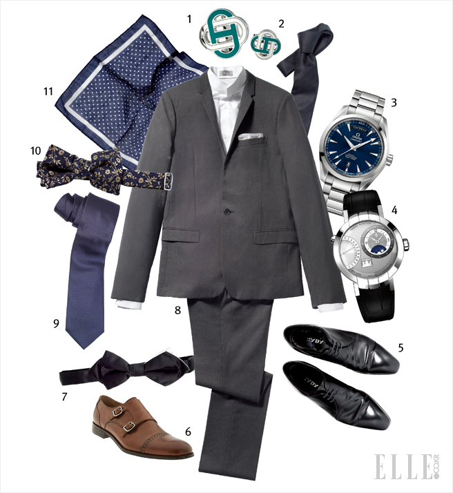 8 모던한 디자인의 슬림 피트 그레이 수트와 화이트 셔츠는 가격 미정, 모두 디올 옴므. 포켓치프는 5만8천원, 클럽 모나코.