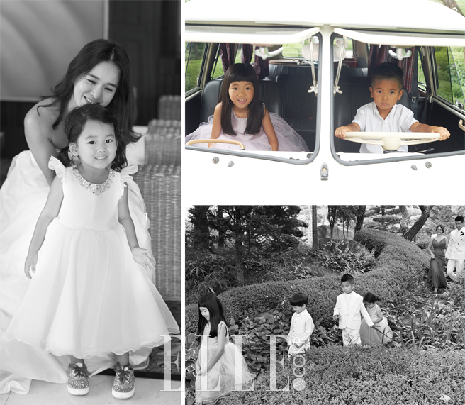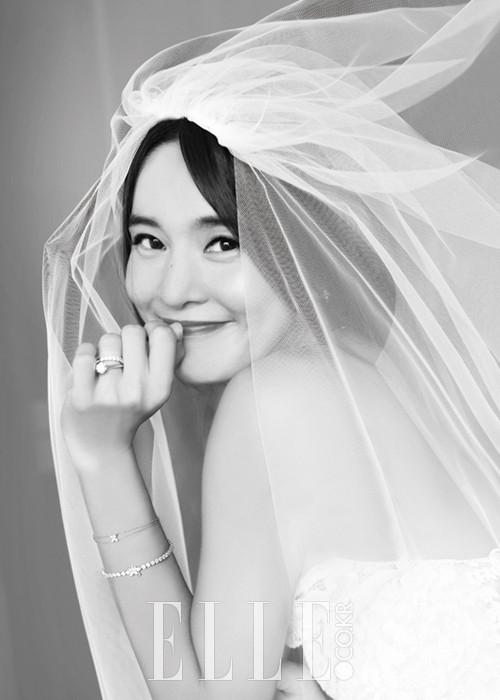 정혜영이 입은 레이드 드레스는 Reehue. 쇼트 베일은 Carrie bridal. 네 번째 손가락의 볼드한 다이아몬드 링, 레이정혜어드 링, 꽃잎 모티프의 브레이슬렛과 이어링은 모두 Tiffany & Co.