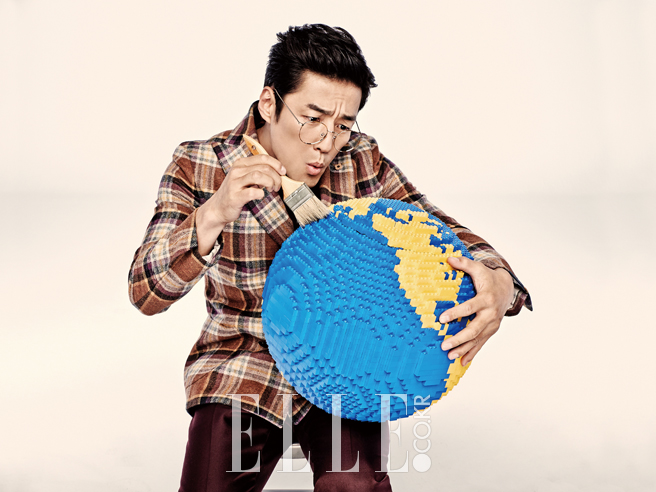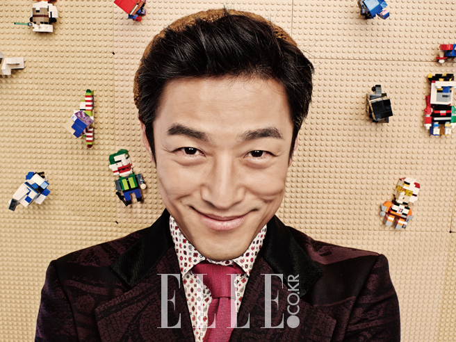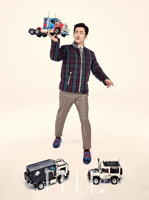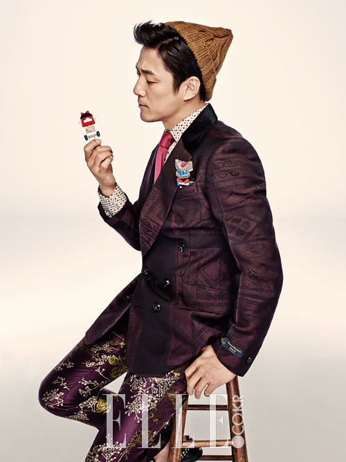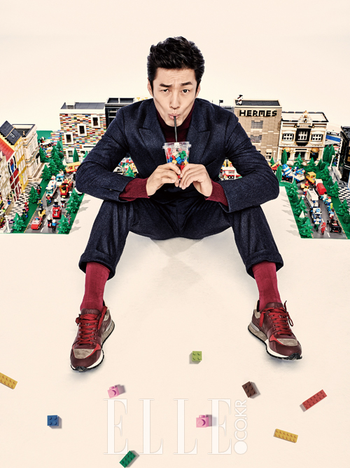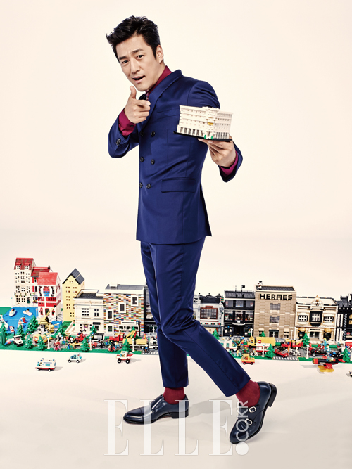 네이비 숄라펠 수트는 Baton Kwonohsoo. 퍼플 셔츠는 Prada. 페이즐리 패턴의 타이는 Etro. 더블 몽크 슈즈는 Yanko by Gentlecurve. 양말은 스타일리스트 소장품. 지진희가 손에 든 레고는 새롭게 리뉴얼하는 신세계백화점 본점 건물을 레고로 만드는  프로젝트를 위해 미니어처 버전으로 제작한 것. 오는 10월 공개 예정.