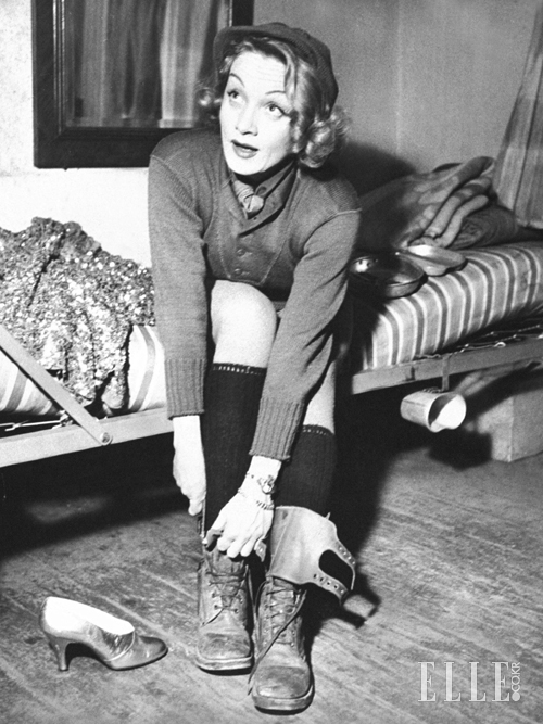 빈틈이라곤 한 군데도 없을 것처럼 팜므 파탈의 차가운 인상, 한치의 흐트러짐도 없는 완벽한 룩을 갖춘 모습만 보여주던 마들렌. 그녀에게서 좀처럼 찾아보기 힘든, 다소 허둥대는 순간이 포착됐다. 1945년 제2차 세계대전 당시 미군 부대에 위문 공연차 방문한 그녀는 조금 전까지 군인들의 열광적인 환호 속에서 눈부신 시퀸 드레스에 새틴 힐을 신고 무대 위에 올랐다가 다음 무대를 위해 백스테이지에 마련된 군용 침대에 앉아 스포팅 니트 스웨터로 갈아입고 니트 양말, 니트 베레를 쓰고 무거운 군화를 신느라 진땀 빼는 중이다.