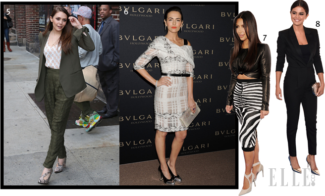5 매니시한 수트에 여성스러운 톱과 파이톤 레더 힐을 매치한 엘리자베스 올슨의 센스가 돋보인다.