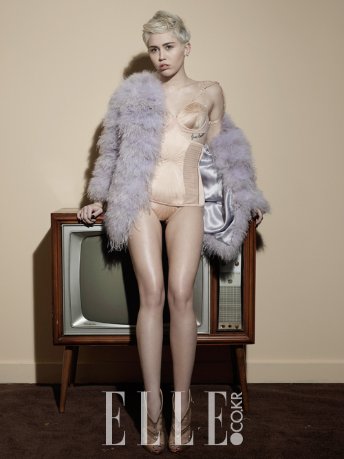 연보라색 페더 재킷은 Ralph Lauren Collection, 실크 새틴 소재 브라, 코르셋, 브리프는 모두 La Perla, 반짝이는 메시 소재 앵클부츠는 Christian Louboutin, 귀고리는 마일리 사이러스 본인 소장품.