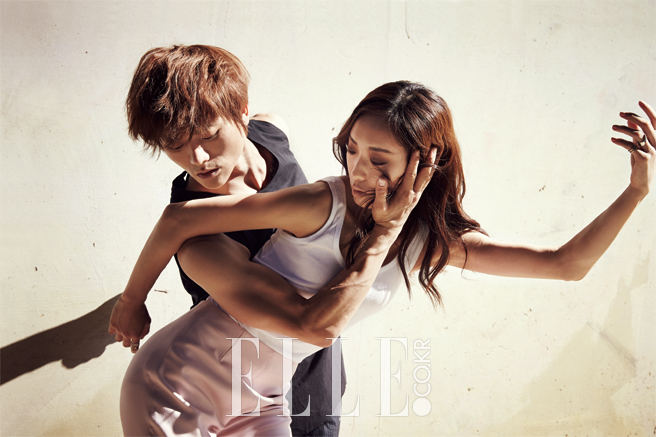 김설진의 블랙 톱은 Rookiebud. 도트 팬츠는 Dior Homme. 최수진의 화이트 탱크 톱과 누디 핑크 팬츠는 모두 Ralph Lauren Collection.
