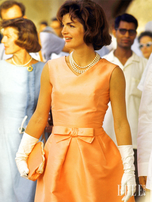 재클린 캐네디는 인도 방문 당시 오스카 드 라 렌타의 복숭아빛 실크 드레스를 입었다.