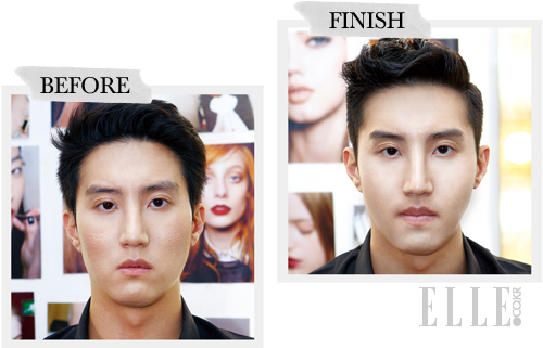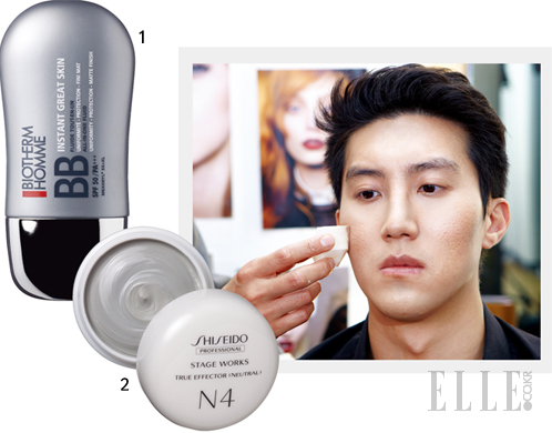 STEP 2 내추럴한 피부 표현 ‘화장한 티’가 나는 것을 지독히 싫어하는 그를 위해 피부 톤에 딱 맞는 컬러의 BB크림을 사용했다(피부 톤보다 조금만 더 밝은 제품을 써도 금세 화장한 티가 난다). 그리고 여드름 자국이나 잡티가 있는 부위에 컨실러로 꼼꼼하게 커버했다.