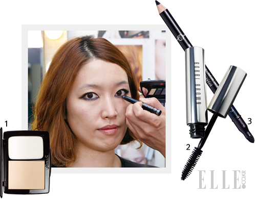 STEP 1 파우더리한 피부 새틴처럼 섬세하고 화사한 피부 표현을 위해서 베이스 메이크업을 보다 세밀하게 나눠 진행했다. 우선 정성스레 스킨케어를 마친 피부에 옐로 톤이 적은 페일한 베이스를 얼굴 전체에 바르고 브라이트닝 효과를 주는 컨실러를 눈 아랫부분에 손가락으로 톡톡 두드려 눈 밑의 다크한 부위를 밝게 표현했다. 그리고 촉촉한 타입의 파운데이션을 고루 바른 뒤 피니싱 파우더로 마무리했다.