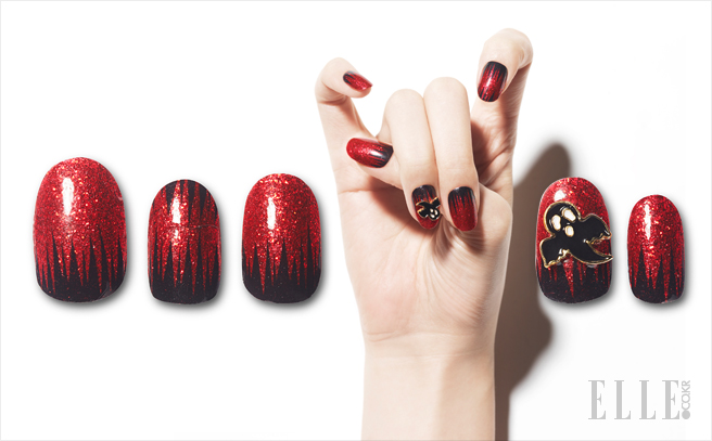 화려한 글리터가 가득 들어 있는 레드 매니큐어를 베이스로 바른다. 그 위에 세필붓에 블랙 매니큐어를 소량 묻혀 큐티클 라인부터 시작해 위로 쭉쭉 과감하게 터치해 준다. 다섯 손가락 중 한 두 개는 손톱 끝 라인에서 큐티클 방향으로도 거칠게 선을 그려줘도 좋다. 가느다란 붓의 거친 터치감과 날카로움이 괴기스러운 할로윈 느낌을 배가시키는 듯. 위트를 가미하고 싶다면 유령 모양 또는 자신이 원하는 다양한 할로윈 무드의 네일파츠를 전용 글루로 붙여주면 완성!