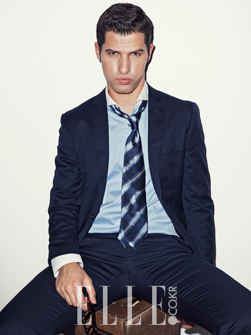 네이비 싱글 수트와 사선 처리된 스트라이프 타이는 Boggi Milano. 클레릭 셔츠는 S.T. Dupont. 브라운 컬러의 라운드 프레임 안경은 Moscot by Moscot Seoul.