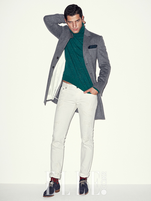 그린 터틀넥은 Beanpole Men. 그레이 코트는 Dsquared2. 화이트 디스트로이드 진은 Dolce & Gabbana. 슈즈는 Dunhill. 그린 도트 포켓 스퀘어는 Brunello Cucinelli. 체크 양말은 스타일리스트 소장품.