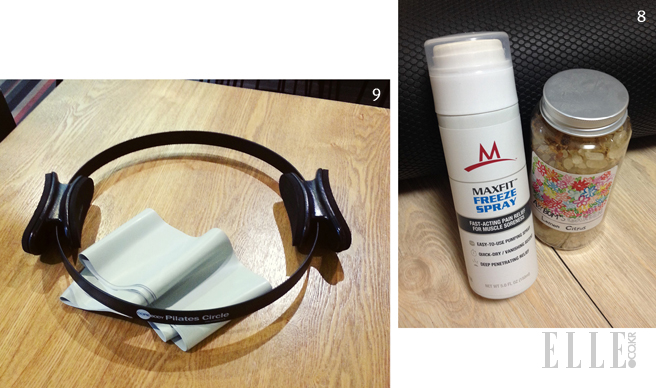 IN THE GYM갸마드르 by 온뜨레 비비크림은 피부 숨구멍을 막지 않으면서도 톤을 보정해 주어 애용한다. 호흡을 반복하다 보면 입술이 쉽게 건조해지기 때문에 눅스 립밤도 두텁게 바른다. 혹시 모를 땀 냄새가 신경 쓰여 향수도 준비하는데, 휴대하기 편한 미니 사이즈를 주로 챙긴다. 상큼하고 가벼운 조 말론 런던 라임 바질 앤 만다린은 여름에 특히 애용하는 제품. 향이 묵직하고 진한 프레데릭 말 프렌치 러버와 러쉬 시킴 걸스는 손목과 귀 뒤, 발목에 살짝 터치한다. 땀 냄새 걱정 없이 시크한 향을 풍기며 운동하기 위한 것.