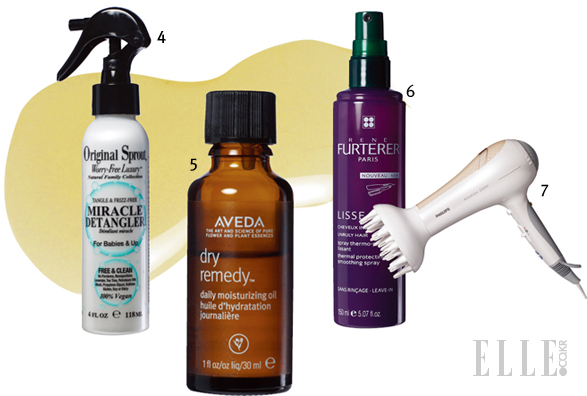 4,5,6,7 ‘머릿발’ 살려주는 헤어 제품 넷. 엉킨 모발에는 오리지널 스프라우트 디탱글러를, 손상된 모발 끝에는 아베다 드라이 레미디 오일을 바른다. 풍성한 헤어스타일을 위해 필립스 액티브케어 드라이기로 모근에 바람을 넣어주고, 열기구 사용 전에는 르네휘테르 리세아 스프레이를 뿌려 모발 손상을 방지.