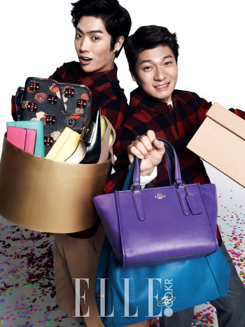 타쿠야와 장위안이 입은 블랙 앤 레드 체크무늬의 재킷과 브라운 부츠, 타쿠야의 선물 상자 안 플로럴 주얼 장식 백과 옐로, 터쿠아즈, 핑크 컬러의 장지갑, 메탈 장식의 포인티드 힐, 장위안이 들고 있는 퍼플 토트백과 블루 숄더백은 모두 Coach. 베이지, 그레이 팬츠는 모두 COS.