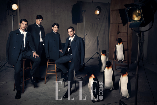 알베르토, 타쿠야, 로빈, 다니엘이 입은 블랙 피코트, 로빈의 더블 버클 블랙 슈즈는 모두 Coach. 펭귄 인형은 모두 Hansatoy.