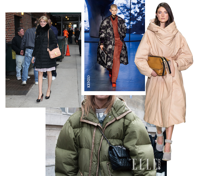 누구나 옷장에 하나쯤 있는 오버사이즈 패딩 코트. 자칫 패딩 특유의 부피감으로 인해 투박한 아이템이라 치부할 수 있지만, 집채만한 오버사이즈 두베 코트가 트렌드로 추앙받는 시즌이 왔으니 다시 빛을 볼 차례다. 담백한 스니커즈, 심플한 와이드 팬츠를 매치해 오버사이즈 실루엣의 매력을 최대한 살려도 좋겠다. 슬림한 실루엣을 절대 포기할 수 없다면 끌로에의 런웨이에 등장한 페미닌한 패딩 스타일을 참고하자. 허리 라인을 잘록하게 강조하는 것만으로도 한결 페미닌한 실루엣이 살아나고, 클러치백과 펌프스로 악센트를 줘 여성스러움을 극대화할 수 있다.