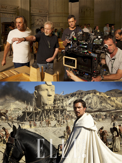 (위) <엑소더스: 신들과 왕들> 촬영현장의 리들리 스콧 감독(왼쪽에서 두 번째).