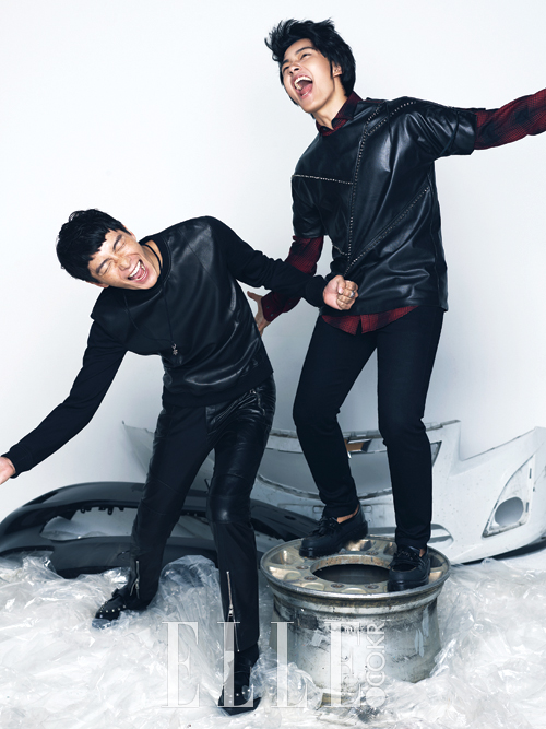 여진구가 쓴 레더 모자는 Gucci, 레더 재킷은 Sandro Homme, 프린트 셔츠는 Dr. Martens, 티셔츠는 Diesel, 블랙 팬츠는 Vandalist, 슈즈는 Gucci, 링은 Justin Davis. 이민기가 입은 화이트 메시 톱과 캐시미어 롱 카디건, 퍼 라인드 바이커 재킷은 모두 Burberry Prorsum, 블랙 팬츠는 Juun. J, 레더 하이톱 슈즈는 Dior.