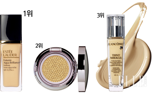 1위 퓨처리스트 아쿠아 브릴리언스 리퀴드 파운데이션 SPF 15/PA++, 8만원, 에스티 로더. 촉촉하기 그지없는 포뮬러로 손을 써도 뭉침이나 들뜸 없이 가볍게 발리고, 자연스러운 광채를 선사한다고 입소문이 자자하다. 히알루론산과 세라마이드가 함유돼 메이크업 후에도 수분감이 유지되는 효과.