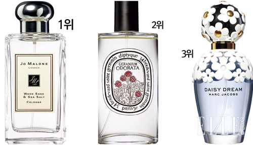 3위 데이지 드림 오 드 뚜왈렛, 100ml 11만2천원, 마크 제이콥스. 데이지 라인의 인기에 힘입어 출시한 세 번째 향수. 푸른 하늘을 본뜬 블루 컬러 보틀과 데이지 꽃 모양의 레이스 패턴이 먼저 눈길을 사로잡는다. 소녀 감성을 자극하는 가볍고 청초한 플로럴 프루티 계열로 20대 여성들의 뜨거운 관심을 모았다.